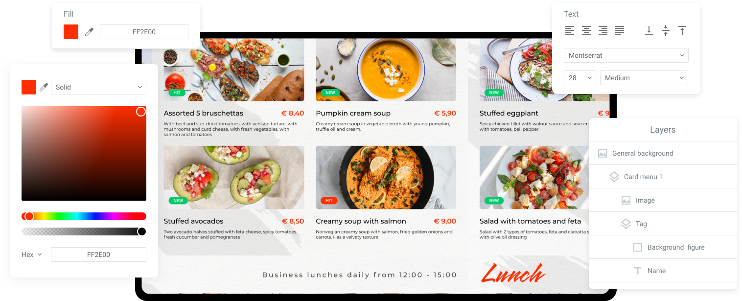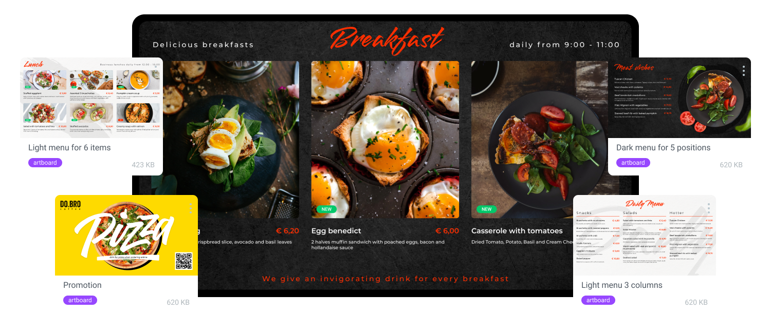 Quickly create content without the help of a designer based on ready-made templates. You can also display documents, web pages, YouTube videos and live broadcasts.
